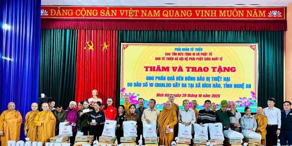 Ngày 29/10, Hội Chữ thập đỏ tỉnh Nghệ An phối hợp với Phái đoàn Từ thiện – Ban Từ thiện xã hội Hệ phái Phật giáo Khất sĩ Thành phố Hồ Chí Minh và Ủy ban Mặt trận Tổ quốc các xã Bích Hào, Thiên Nhẫn, tỉnh Nghệ An tổ chức chương trình trao quà hỗ trợ người dân bị ảnh hưởng do hoàn lưu bão số 10 (Bualoi).