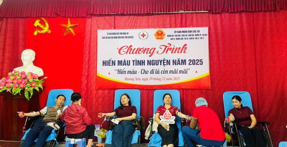 Ngày 19/12/2025, tại Trung tâm Chính trị xã Mường Xén, Ban Vận động Hiến máu tình nguyện tỉnh phối hợp với Trung tâm Huyết học – Truyền máu tỉnh Nghệ An và UBND các xã: Mường Xén, Hữu Kiệm, Chiêu Lưu, Nậm Cắn, Mường Típ, Na Ngoi, Huồi Tụ, Mường Lống, Bắc Lý, Mỹ Lý, Na Loi, Keng Đu tổ chức Chương trình hiến máu tình nguyện, với thông điệp “Hiến máu – Cho đi là còn mãi”.
